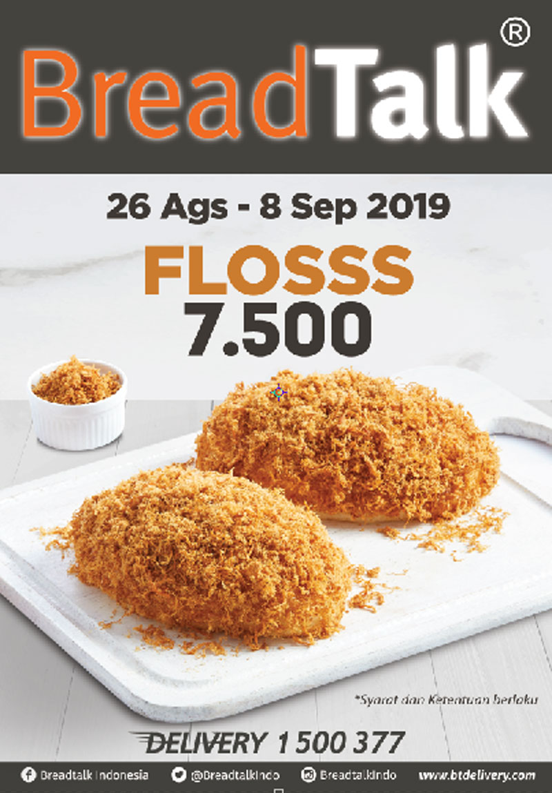 GANLOP.COM – Kalian pecinta roti, khususnya Roti Flosss BreadTalk? Ada kabar gembira neh, BreadTalk Indonesia kembali memberikan promo spesial untuk signature product sekaligus best-selling product, yaitu Roti Flosss dengan beberapa varian seperti Fire Flosss, C’s Flosss dan Rendang Flosss, seharga Rp.7.500,-