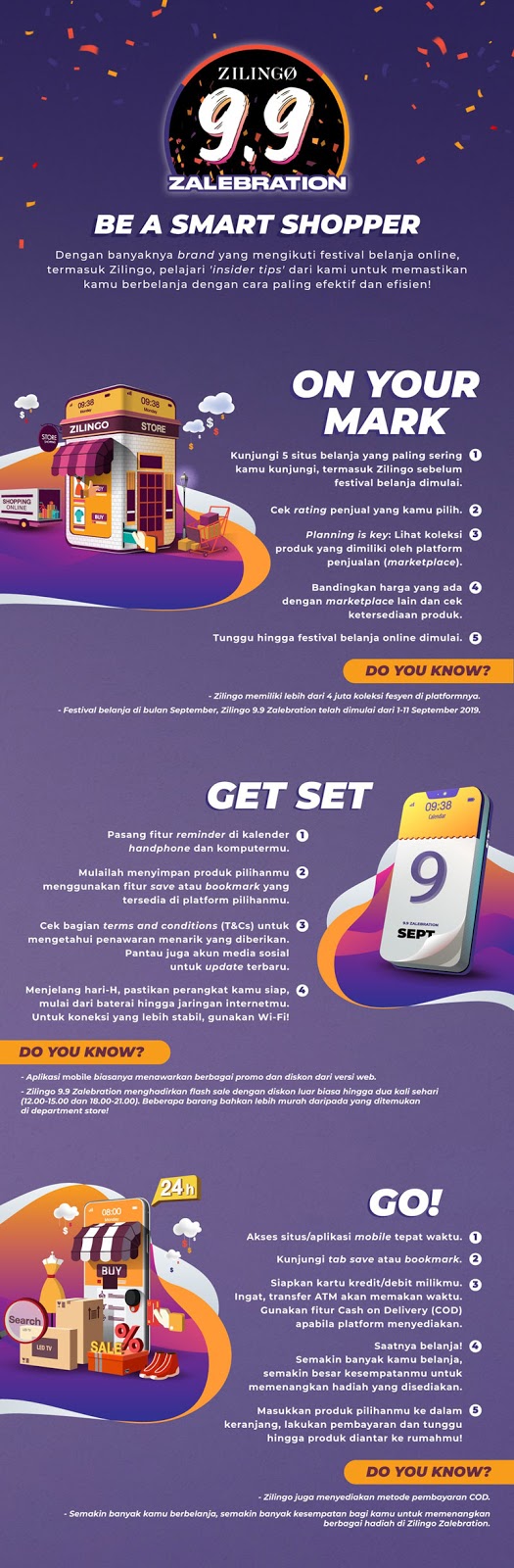 Zilingo akan memulai kampanye dengan Zilingo 9.9 Zalebration yang berlangsung dari 1 hingga 11 September 2019. Pelanggan dapat menantikan penawaran menarik seperti flash sale dengan diskon sebesar 99% (diselenggarakan dua kali dalam sehari, di siang hari dari jam 12-3 siang dan di sore hari jam 6-9 malam) dan harga terendah mulai dari Rp 9.000.