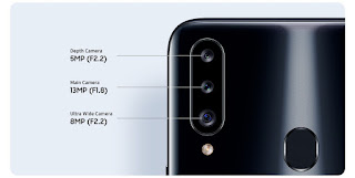 Ketiga kamera terdiri dari resolusi 13MP + 8MP dan 5MP. Dimana kamera 13MP menggunakan lensa wide yang di dukung aperture f/1.8 dan fitur PDAF. Lalu kamera 8MP sudah berjenis ultrawide dengan aperture f/2.2, serta kamera 5MP merupakan depth sensor untuk menghasilkan foto bokeh.