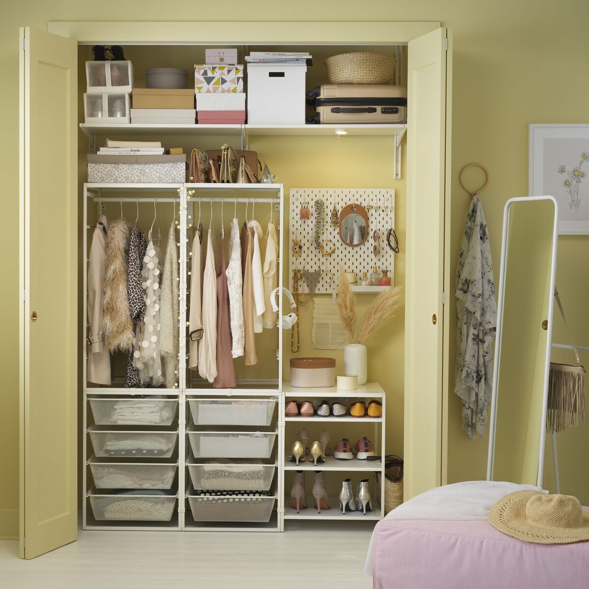 Anda dapat memanfaatkan penyimpanan JONAXEL dikombinasikan dengan kompartemen dan kotak untuk meletakkan pakaian yang dilipat, syal, atau sepatu. Dengan menggunakan aksesoris penyimpanan, Anda dapat memaksimalkan penggunaan ruang di dalam lemari.