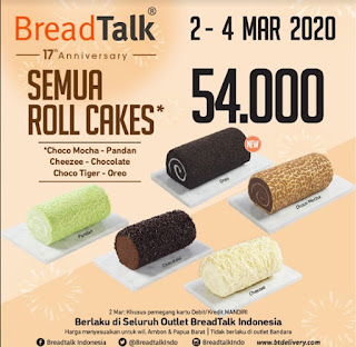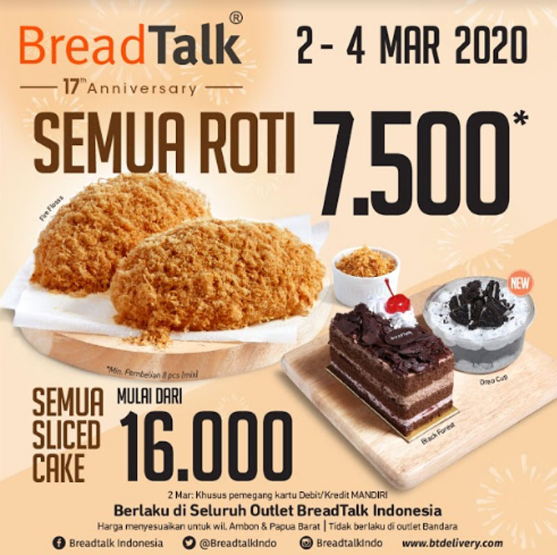 Sebagai ungkapan terimakasih untuk 17 tahun kebersamaan dan dalam upaya untuk terus memanjakan customernya, BreadTalk menghadirkan program promo yang sangat menarik danpastinya sudah ditunggu oleh para BreadTalk Lovers di tanggal 2 – 4 Maret 2020 : SEMUA ROTI Rp 7.500,-
