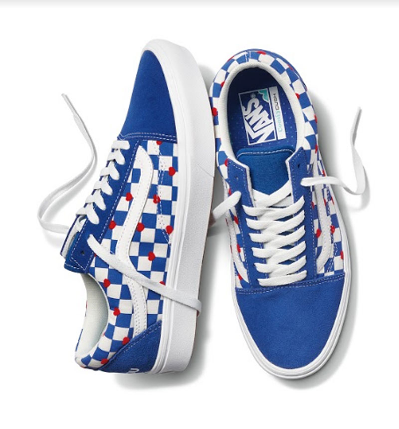 ComfyCush Old Skool merupakan koleksi perdana dengan kain suede berwarna biru dibagian atas sepatu, motif checkerboard dihiasi motif hati berwarna merah velvet dan sebuah pesan khusus di bagian belakang setiap tumit sepatu.