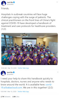 Dalam cuitan di akun twitter resminya, Jack Ma mengajak semua pihak untuk membagi tautan pedoman ini: “Saya butuh bantuan Anda semua untuk membagikan pedoman ini ke rumah sakit, dokter, perawat, dan siapapun yang perlu mengetahuinya di seluruh dunia. Pedoman ini tersedia di covid-19.alibabacloud.com. Kita bisa melalui ini bersama-sama!”