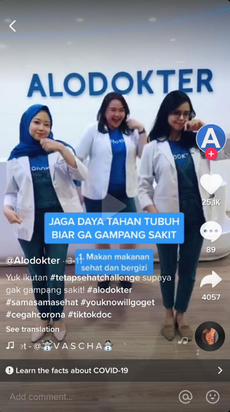 Alodokter memanfaatkan platform TikTok untuk mengedukasi masyarakat terkait pandemi ini, seperti cara mengenali gejala terkena Coronavirus, melakukan physical distancing, dan juga menjaga daya tahan tubuh agar tidak terpapar virus tersebut. Mulai aktif di TikTok sejak bulan Februari, saat ini akun Alodokter sudah memiliki 92.7 ribu pengikut dan 740.5 ribu likes. Bahkan video cara mencuci tangan yang pernah diunggah Alodokter telah ditonton sebanyak lebih dari 3 juta kali.