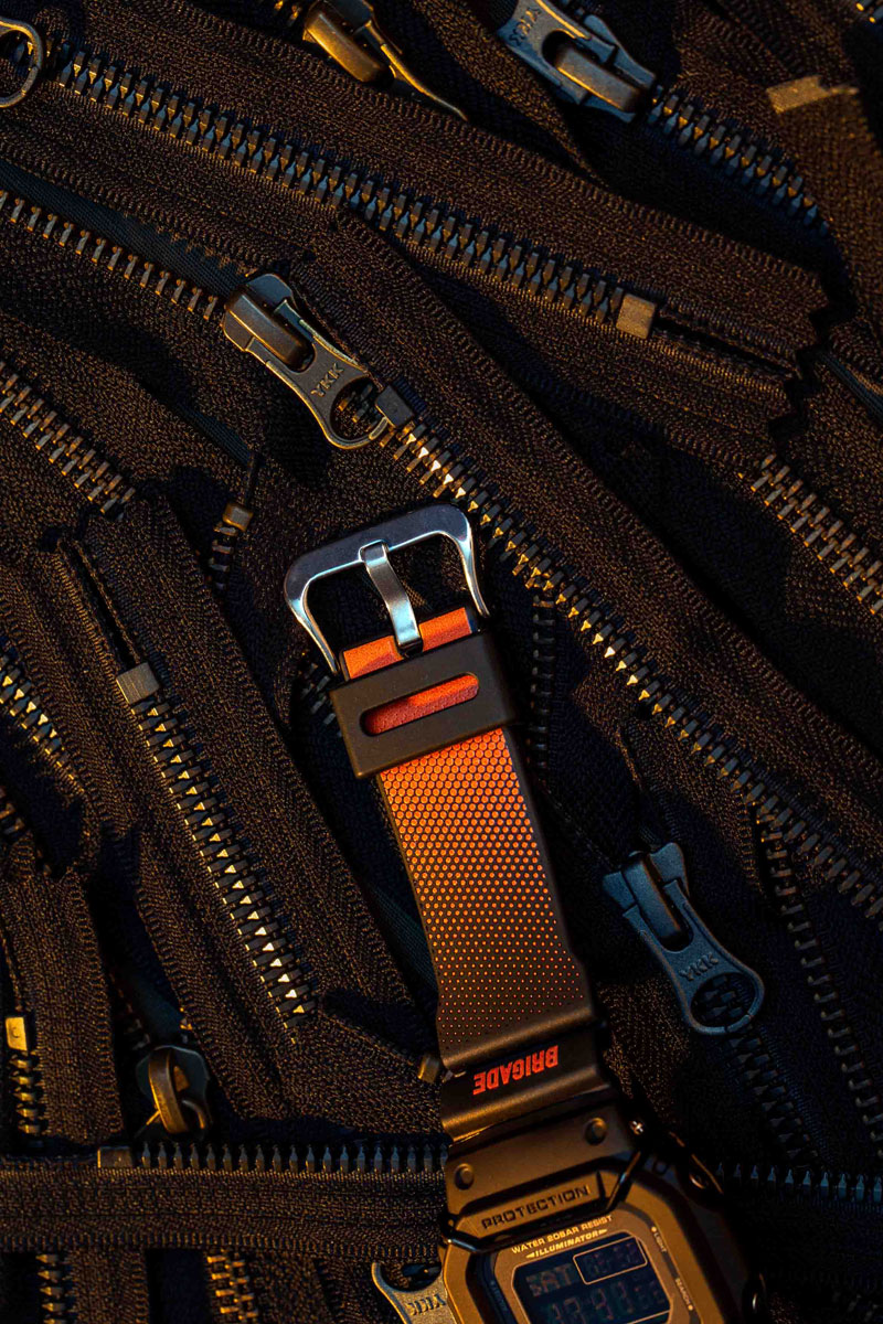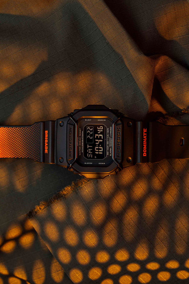 DW-5600P dibuat dengan bahan resin hitam matte dengan strap berwarna hitam gradasi oranye, dengan tulisan“BRIGADE” dan “DOMINATE” di kedua sisi atas strap. Muka jam ini terlihat sangat khas dilengkapi bulbar, yaitu pelindung muka yang sering ditemukan di tahun-tahun pertama G-SHOCK, terutama bagi penggemar skateboard.