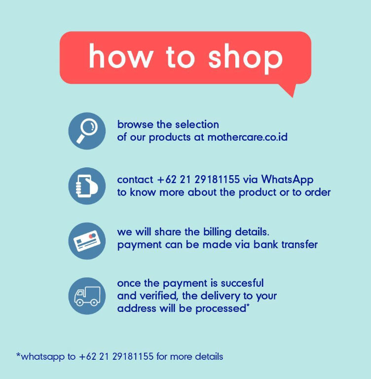 Kesehatan dan keselamatan pelanggan serta karyawan kami merupakan prioritas utama, guna untuk mengurangi kontak secara langsung, Mothercare menghadirkan program Chat & Shop. Melalui program ini, Mothercare memperluas pengalaman berbelanja tanpa harus datang ke gerai Mothercare hanya dengan menghubungi nomor whatsapp +622129181155 dan barang akan disampai di depan pintu rumah Anda.