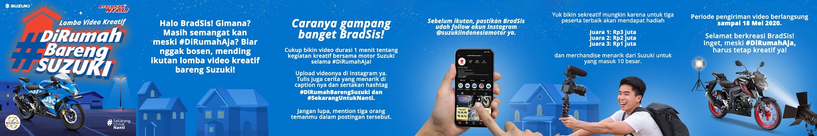 Sementara untuk warganet pengguna sepeda motor Suzuki, kompetisi ini bisa diikuti dengan cara mengunggah video kreatif berdurasi 1 menit yang memperlihatkan kegiatan di rumah bersama sepeda motor Suzuki kesayangan. Video kreatif harus diunggah ke akun Instagram masing-masing dengan menyertakan tagar yang sama yaitu #DiRumahBarengSuzuki dan #SekarangUntukNanti serta mention akun Instagram Suzuki motor @suzukiindonesiamotor. Tentunya sudah disiapkan hadiah uang tunai dan hadiah menarik lainnya untuk para pemenang dari masing-masing kompetisi.