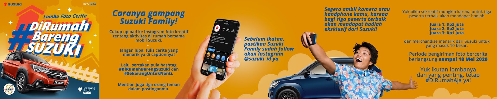 Dalam kompetisi #DiRumahBarengSuzuki, warganet diajak untuk menginspirasi orang lain melalui kegiatan-kegitan positif di rumah selama masa pandemi ini. Bagi warganet pengguna mobil Suzuki, dapat mengikuti kompetisi ini dengan mengunggah foto kreatif saat beraktivitas di rumah bersama mobil Suzuki ke akun Instagram masing-masing dengan menyertakan tagar #DiRumahBarengSuzuki dan #SekarangUntukNanti dan mention akun Instagram Suzuki mobil @suzuki_id.