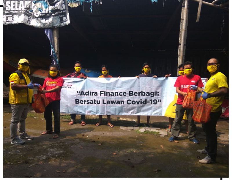2. Adira Finance Peduli Covid-19, dilaksanakan di 9 (sembilan) titik area operasional Adira Finance seluruh Indonesia bekerja sama dengan Pemerintah Daerah setempat dengan memberikan donasi paket sembako kepada masyarakat yang terkena dampak Covid-19 dan APD ke beberapa fasilitas kesehatan yang menangani virus ini.