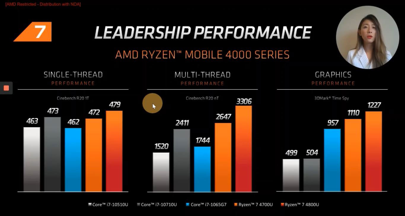 Paige Shi selaku Head of APAC Consumer Business AMD memaparkan bahwa Prosesor AMD Ryzen 4000 terbaru membawa Zen 2 core yang memiliki instruksi per clock lebih tinggi 15% melalui teknologi 7nm dengan densitas transistor ganda, serta konsumsi daya SOC 20% lebih rendah dan performa per watt ganda yang dapat meningkatkan efisiensi daya. Dengan deretan keunggulan tersebut, mengantarkan AMD menjadi perusahaan yang kini memimpin performa mobile baik dalam hal performa grafis, performa multi-thread, dan performa single-thread yang jauh lebih baik dari pesaingnya.