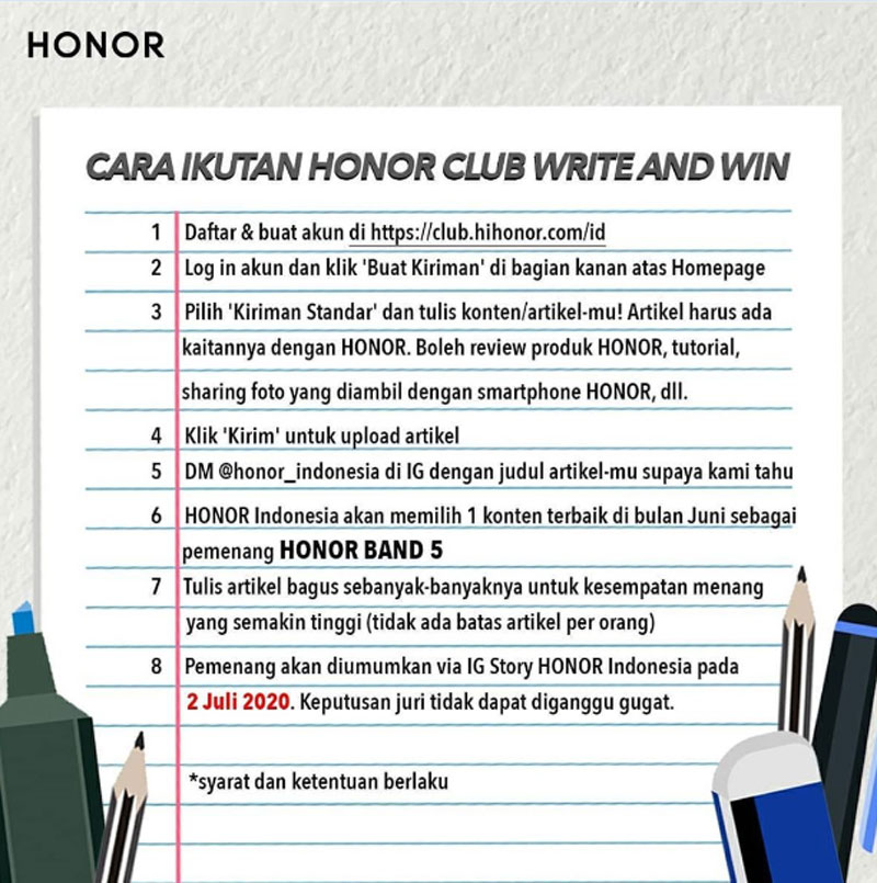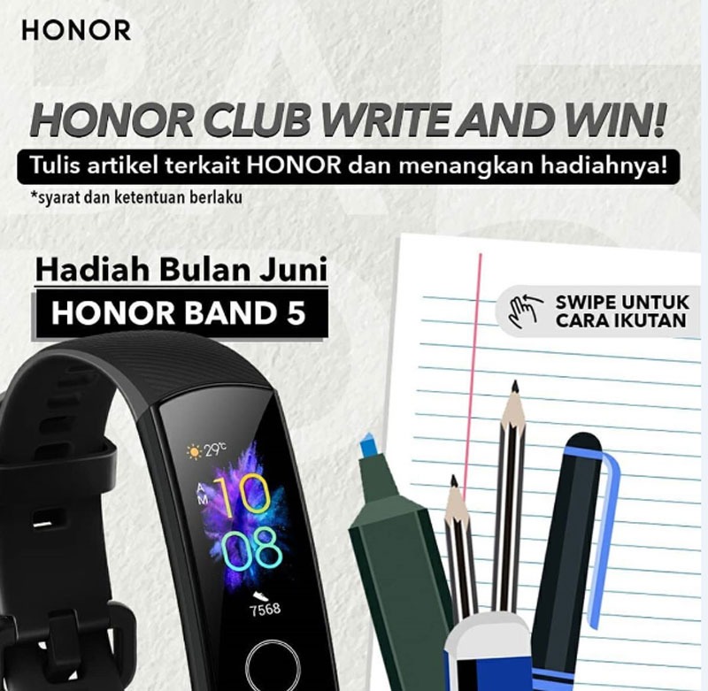 Sebagai bentuk penghargaan bagi konsumen, HONOR mempersiapkan giveaway di mana Anda dapat berpartisipasi dalam Honor Club Write and memenangkan HONOR Band 5. Informasi yang lebih lengkap tentang giveaway ini dapat dilihat pada media sosial HONOR (@honor_indonesia).