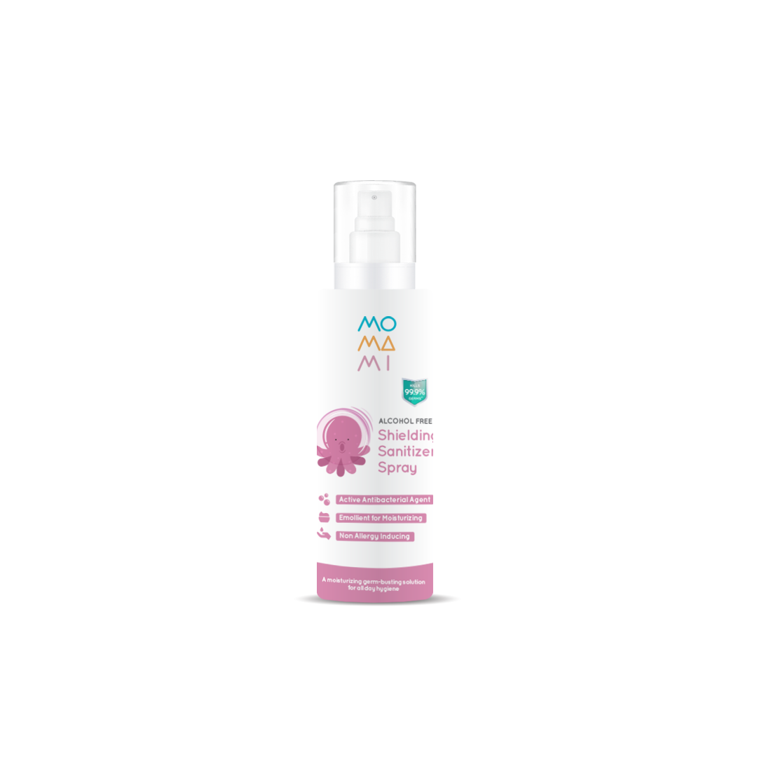 Mengandung active antibacterial agents yang memiliki fungsi ganda selain membersihkan sekaligus melindungi kulit dari kuman dan bakteri. MOMAMI Sanitizer Spray merupakan suatu inovasi proprietary formula dari gabungan senyawa garam mineral yang ampuh dalam membunuh kuman, virus dan bakteri dalam hitungan detik. Beberapa kandungan natural yang terdapat di dalamnya diantaranya: acid salts compound yang merupakan senyawa gabungan garam mineral yang terbukti ampuh dalam membunuh virus dan bakteri, pyridinium salts yang banyak digunakan untuk neonatal care, mata dan skin care. Tidak mengandung alkohol dan zat berbahaya seperti klorin, hypoclorous acid dan zat turunannya serta allergen free parfume sehingga tidak menyebabkan iritasi dan alergi. Cairan semprot ini juga food-contact safe yang aman jika bersentuhan dengan makanan atau tertelan.