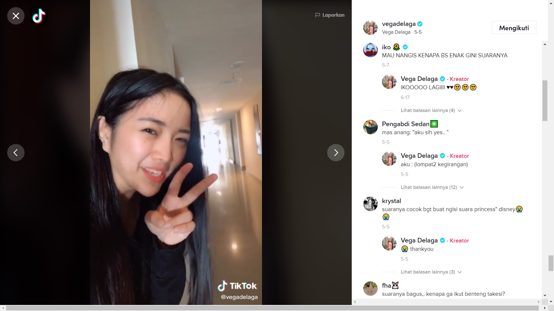 Ada yang ingat konten menyanyi di lorong dari Vega Delaga ini? Di video yang sudah mencapai lebih dari 200 ribu views ini, Vega terlihat sedang mengintip ke luar kamar apartemennya dan menyanyikan lagu dengan kencang hingga menarik perhatian tetangganya. Ternyata di balik video ini, Vega sebenarnya sedang terjebak di kota Makassar dan tidak bisa kembali ke rumahnya di Jakarta karena saat di awal pandemi itu, semua penerbangan dibatalkan. Akibatnya, Vega harus menginap selama beberapa minggu di suatu apartemen di Makassar.