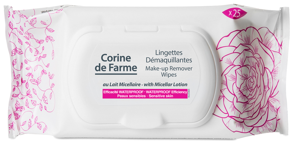 Make-up Remover Wipes Corine de Farme masih menjadi rangkaian produk Micellar dari Corine de Farme yang berupa tissue pembersih wajah dengan Teknologi Micellar dan formula efektif yang dapat menghapus make-up (waterproof), membersihkan dan melembabkan kulit wajah serta area mata dengan sempurna tanpa perlu dibilas. Diperkaya dengan Ekstrak Bunga Peony dan bahan-bahan alami dengan ekstrak cornflower, Make-up Remover Wipes Corine de Farme ini mampu mengangkat sekaligus membersihkan riasan mata dengan menyeluruh dan cepat. Pemakaian produk ini juga sederhana cukup basahi kapas dengan eye make-up removernya, lalu diamkan kapas tersebut pada kelopak mata agar kotoran lebih mudah terangkat, usap halus dari arah dalam keluar. Make-up Remover Wipes Corine de Farme sangat efektif menghapus make-up dan dapat digunakan untuk make-up waterproof serta sangat aman digunakan bagi kulit sensitif karena produknya paraben free, hypoallergenic, ophthalmologist-tested, dermatologist-tested, dan alcohol free.
