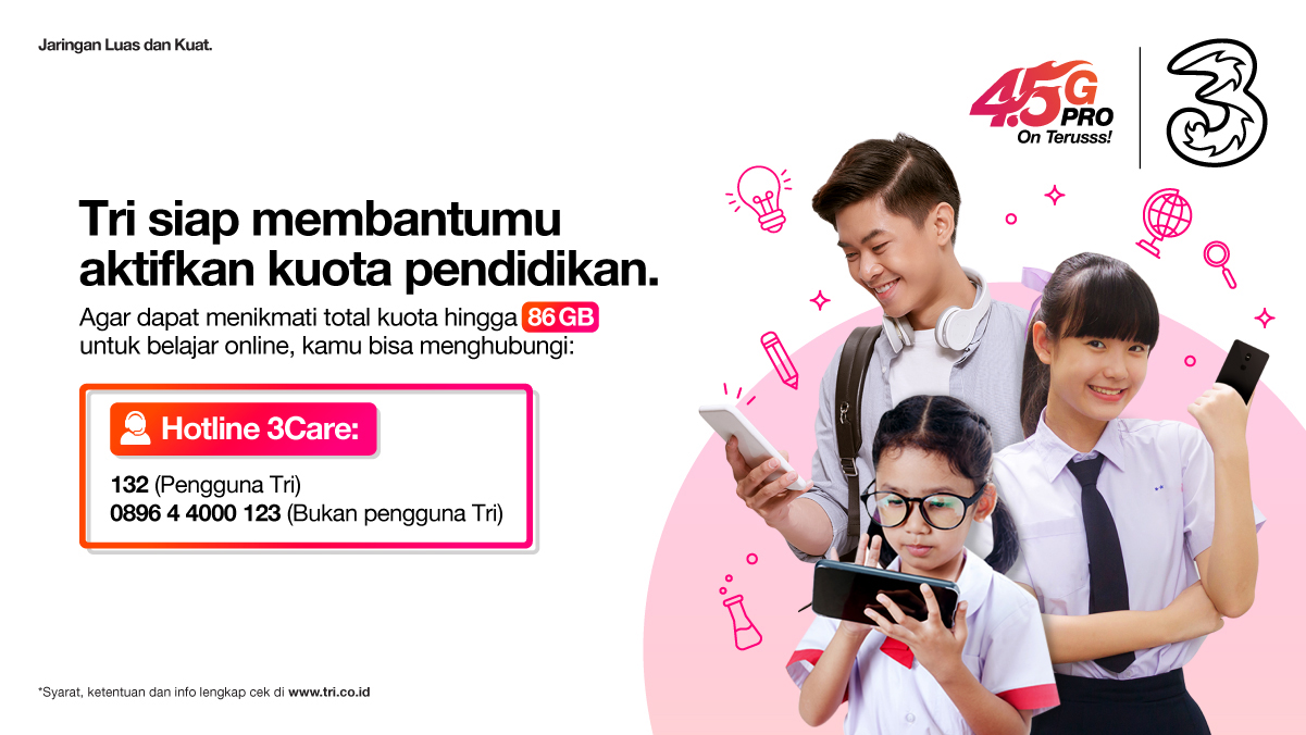 Untuk mendorong kegiatan Pembelajaran Jarak Jauh ini, Kemendikbud dan 3 Indonesia memberikan kuota gratis hingga 86GB didukung dengan jaringan 4.5G Pro yang semakin luas dan kuat. Untuk mendapatkan kuota gratis ini, siswa/mahasiswa/guru/dosen perlu mendaftarkan kartu 3 yang dimilikinya ke sekolah atau perguruan tinggi. Setelah itu, sekolah dan perguruan tinggi akan mendaftarkan nomor tersebut melalui sistem Dapodik dan PDDIKTI untuk merekap semua nomor.