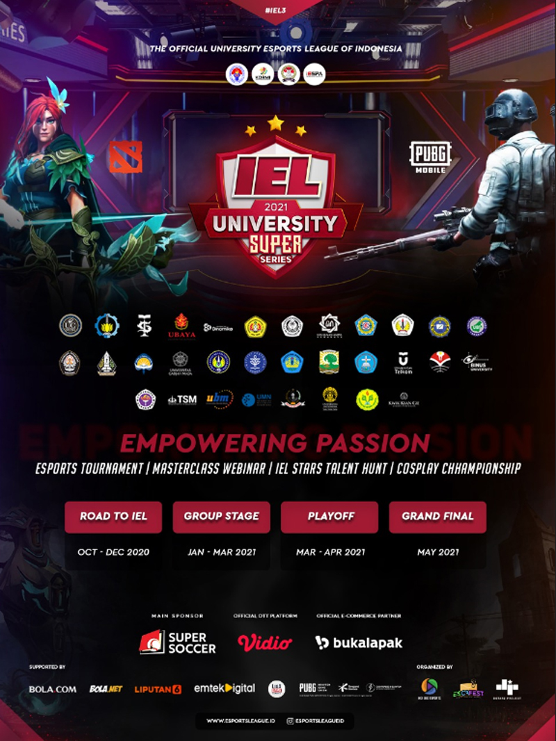 Dengan adanya kesempatan ini, diharapkan dapat membuka peluang bagi para mahasiswa untuk dapat mengembangkan industri Esports di Indonesia. IEL University Super Series Season 3 2021 didukung oleh sponsor utama Super Soccer, Vidio sebagai official OTT Platform dan Bukalapak sebagai Official E-commerce Partner.