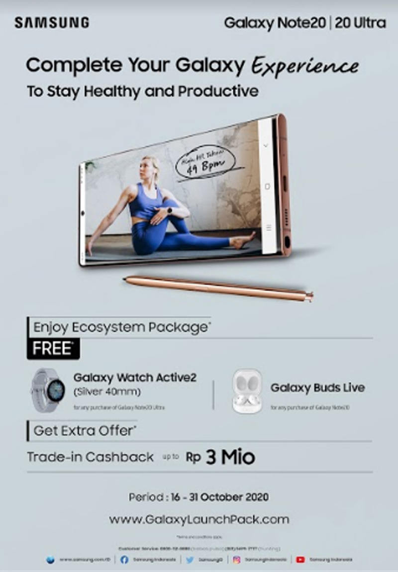 Galaxy Note20 dibanderol dengan harga Rp14.499.000. Sedangkan Galaxy Note20 Ultra varian 256GB memiliki harga Rp17.999.000 dan varian 512GB dibanderol senilai Rp19.999.000. Dan untuk konsumen yang melakukan pembelian tanggal 16-31 Oktober 2020 akan mendapatkan secara langsung Galaxy Watch Active2 untuk pembelian Galxy Note20 Ultra dan Galaxy Buds Live untuk pembelian Galaxy Note20.