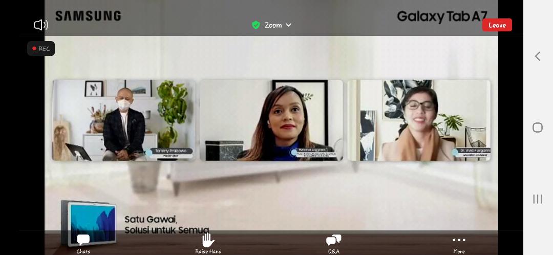 “Saya mengapresiasi kehadiran gawai seperti Galaxy Tab A7 yang mampu berperan banyak, sebagai perangkat edukasi, produktivitas, juga rekreasi, sekaligus peran parental control. Anak-anak belajar lebih lancar dan nyaman, orang tua dapat bonding dengan anak sambil mendampingi mereka, sekaligus menyelesaikan pekerjaan sehari-hari. Tidak kalah pentingnya dari produktif adalah sehat mental, dan ini dapat diciptakan. Happiness is created, no matter where you are. Keluarga dapat memanfaatkan perangkat ini untuk bertemu secara virtual dengan teman-teman atau saudara yang dirindukan, juga memenuhi kebutuhan akan hiburan yang fun ataupun relaksasi.”