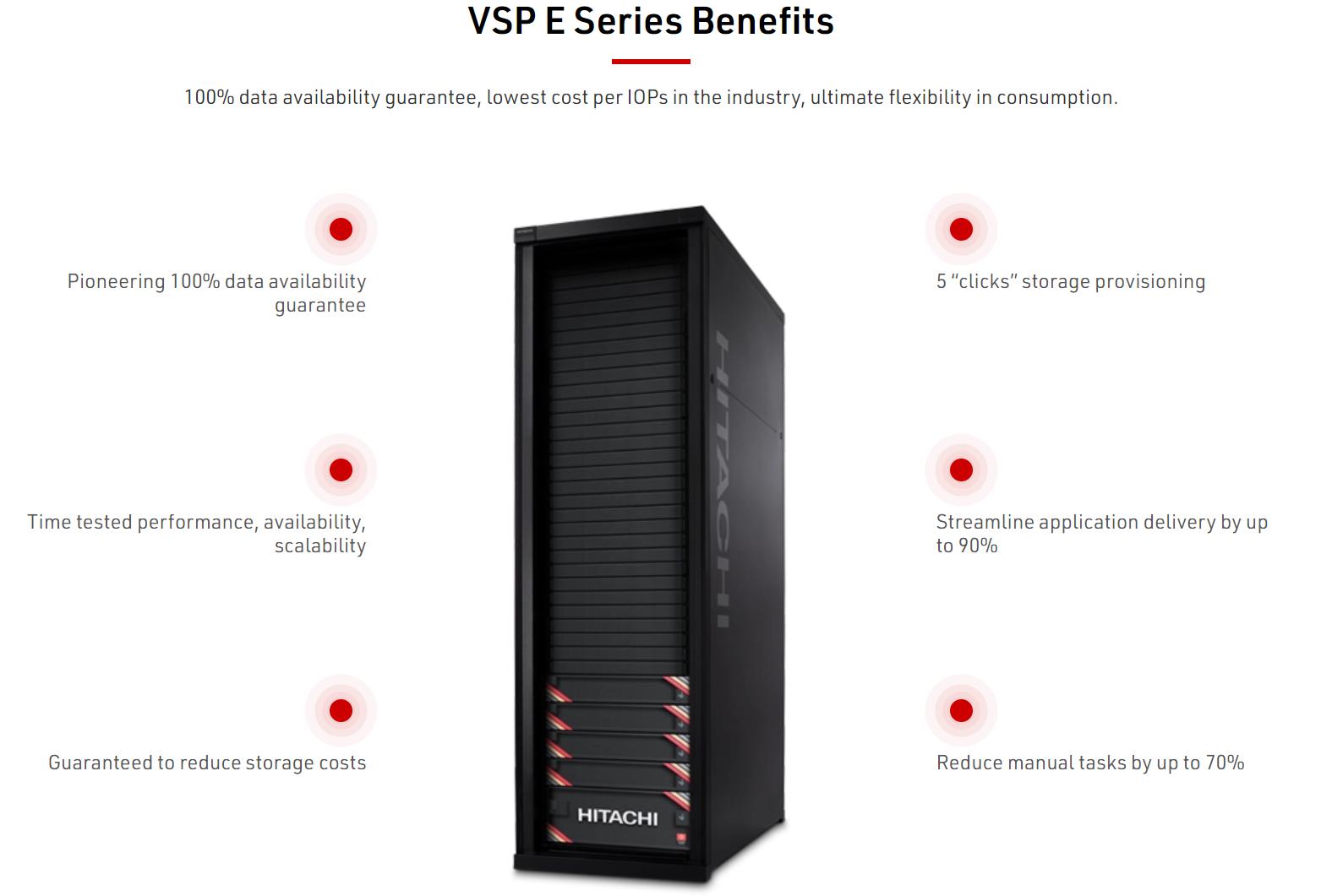 o Lini produk terbaru seri E memiliki fitur manajemen kapabilitas instalasi yang secara dramatis lebih cepat dari semua seri sebelumnya serta mendukung fungsi automated provisioning dan intelligent performance management yang sesuai untuk perusahaan dengan sumber daya yang terbatas. Solusi terbaru ini juga menghadirkan fungsi deployments dan solusi end-to-end analytics, workflow orchestration, yang dapat berjalan secara otomatis, serta juga mendukung software paling mutakhir dari Hitachi Ops Center.