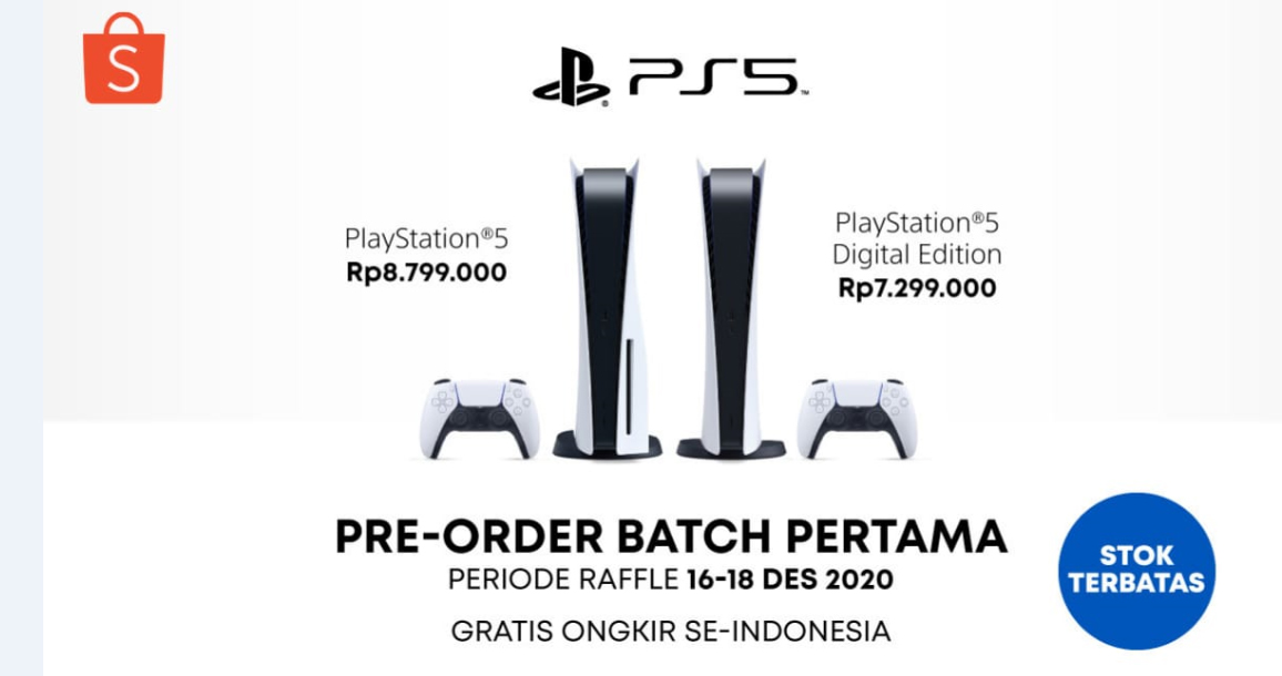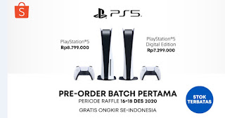 Pengguna dapat mengikuti pre-order batch pertama Sony PlayStation 5 (PS5) dengan membeli undian raffle di Shopee pada tanggal 16-18 Desember 2020. Terdapat dua versi konsol PS5 yang dapat dibeli pengguna, yakni versi digital yang dibanderol dengan harga Rp 7.299.000 dan versi standar yang dijual dengan harga Rp 8.799.000.