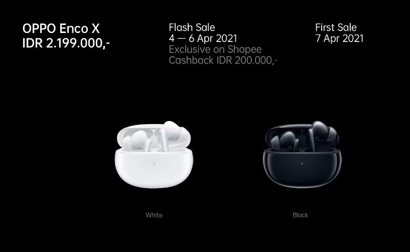 OPPO Enco X, pilihan warna Black dan White, tersedia dengan harga Rp 2.199.000,00. Dapatkan promo cashback Rp 200.000,00 di Exclusive Flash Sale Shopee pada 4-6 April 2021 dan First Sale mulai 7 April di OPPO Gallery, store OPPO, dan toko ritel gadget terdekat.