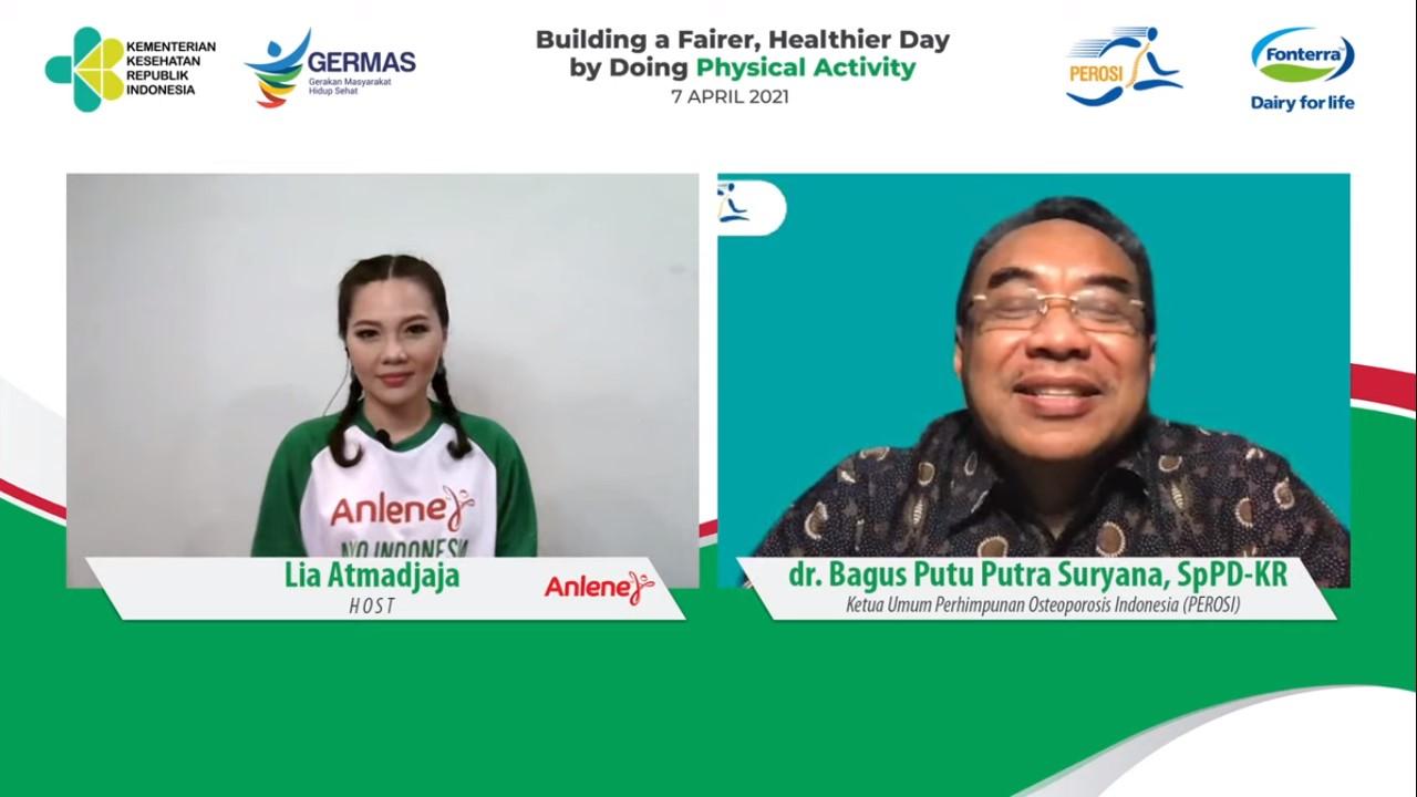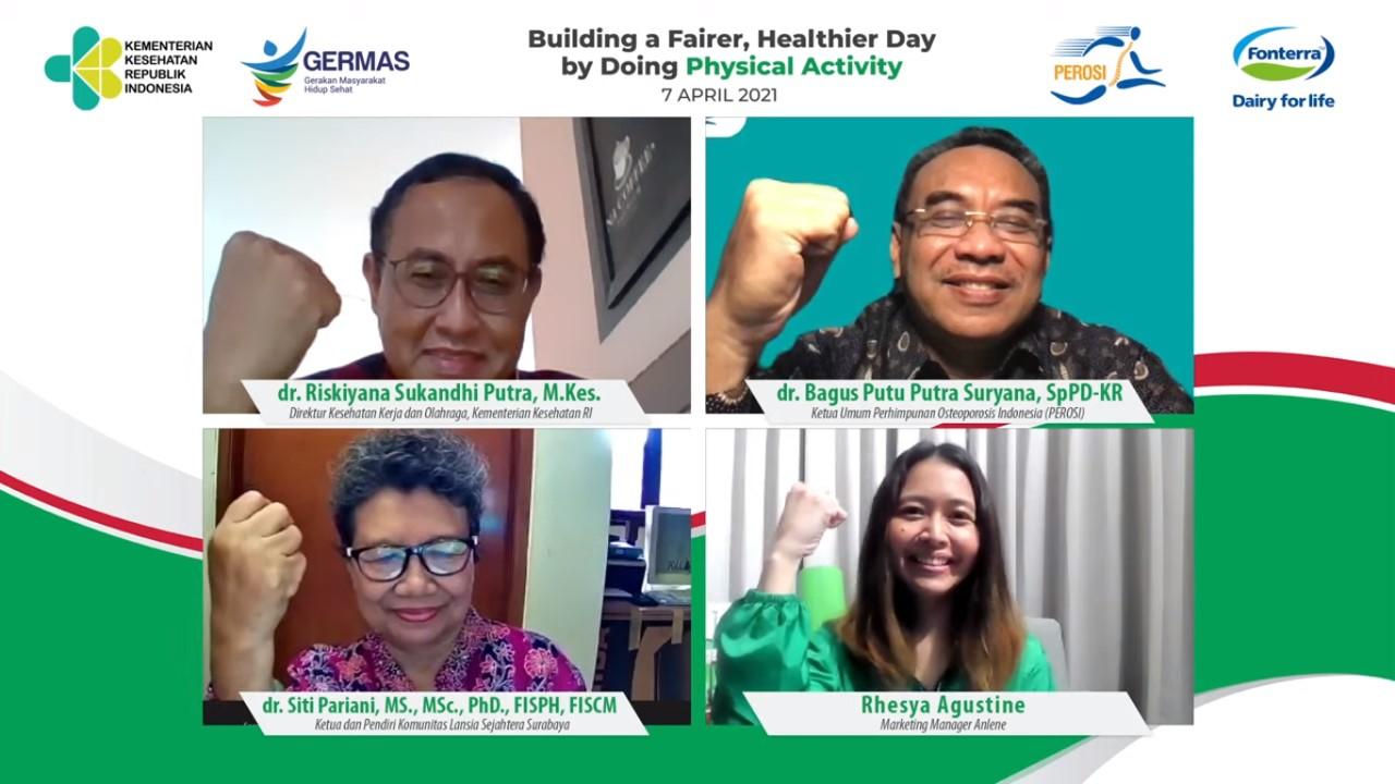 JAKARTA, GANLOP.COM – Dalam rangka Hari Aktivitas Fisik dan Hari Kesehatan Dunia, Fonterra Brands Indonesia melalui brand Anlene, bersama Kementerian Kesehatan Republik Indonesia dan Perhimpunan Osteoporosis Indonesia (PEROSI), mengedukasi dan mendorong masyarakat baik dewasa maupun lansia agar tetap rutin beraktivitas fisik, konsumsi nutrisi seimbang dan deteksi dini. Gaya hidup sehat harus dilakukan sedini mungkin sebagai investasi kesehatan masa depan dan salah satu upaya untuk mendapatkan kualitas hidup lebih baik melalui bidang kesehatan.