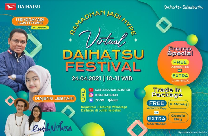 GANLOP.COM – Daihatsu kembali sapa para Sahabat dengan beragam program penjualan menarik melalui acara bertajuk Virtual Daihatsu Festival pada Sabtu, 24 April 2021, pukul 10.00 – 11.00 WIB. Acara ini merupakan komitmen Daihatsu dalam memberikan kemudahan kepada pelanggan untuk mewujudkan impiannya memiliki mobil baru dengan cara yang mudah, aman dan nyaman, tanpa harus datang ke outlet.