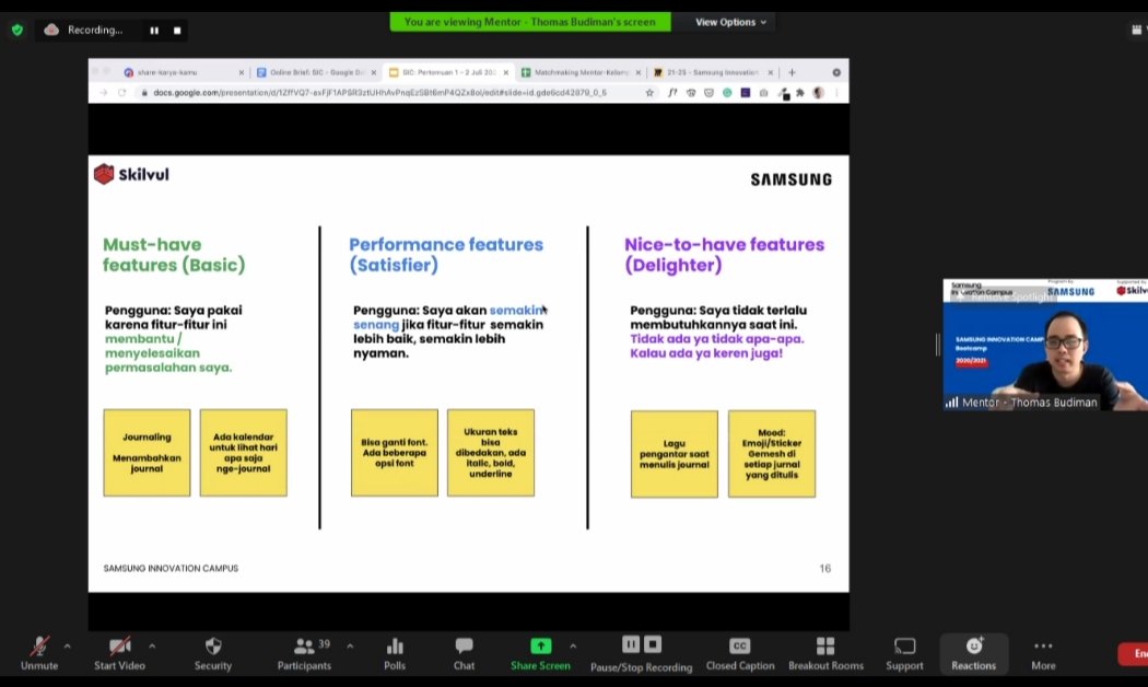 William Hendradjaja, Chief of Business Skilvul mengungkapkan, “Pada pelatihan pengembangan produk program SIC, poin yang perlu menjadi fokus peserta adalah target utama aplikasi atau produk, dan fitur utama yang ada di aplikasi mereka. Mengapa demikian? Karena fungsi dari aplikasi harus bisa menjawab permasalahan yang dihadapi customer atau target pengguna. Jadi, peserta perlu mendetailkan apa saja fitur utama yang benar-benar cocok dan dibutuhkan. Jangan sampai menciptakan fitur yang sia-sia, karena bisa melenceng dari permasalahan yang ingin diselesaikan. Maka dari itu, mereka harus menajamkan fitur dengan menentukan fitur utama dan fitur pendukung.”