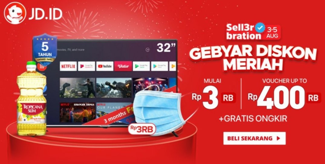 Guna menjawab segala kebutuhan masyarakat agar tetap beraktivitas di rumah selama PPKM saat ini, Marketplace JD.ID memberikan gebyar promo dan diskon yang meriah mulai dari Crazy Deals Rp 3.000,- hingga voucher up to Rp. 500.000,-. Seluruh konsumen setia JD.ID dapat dengan mudah memenuhi segala kebutuhan sehari-harinya dengan berbagai program promo dan diskon Flash Sale & SuperDeal, Bebas Ongkir, Midnight Deals, dan Voucher Official Store 50% untuk berbagai kebutuhan mulai dari makanan dan minuman, kesehatan hingga elektronik.