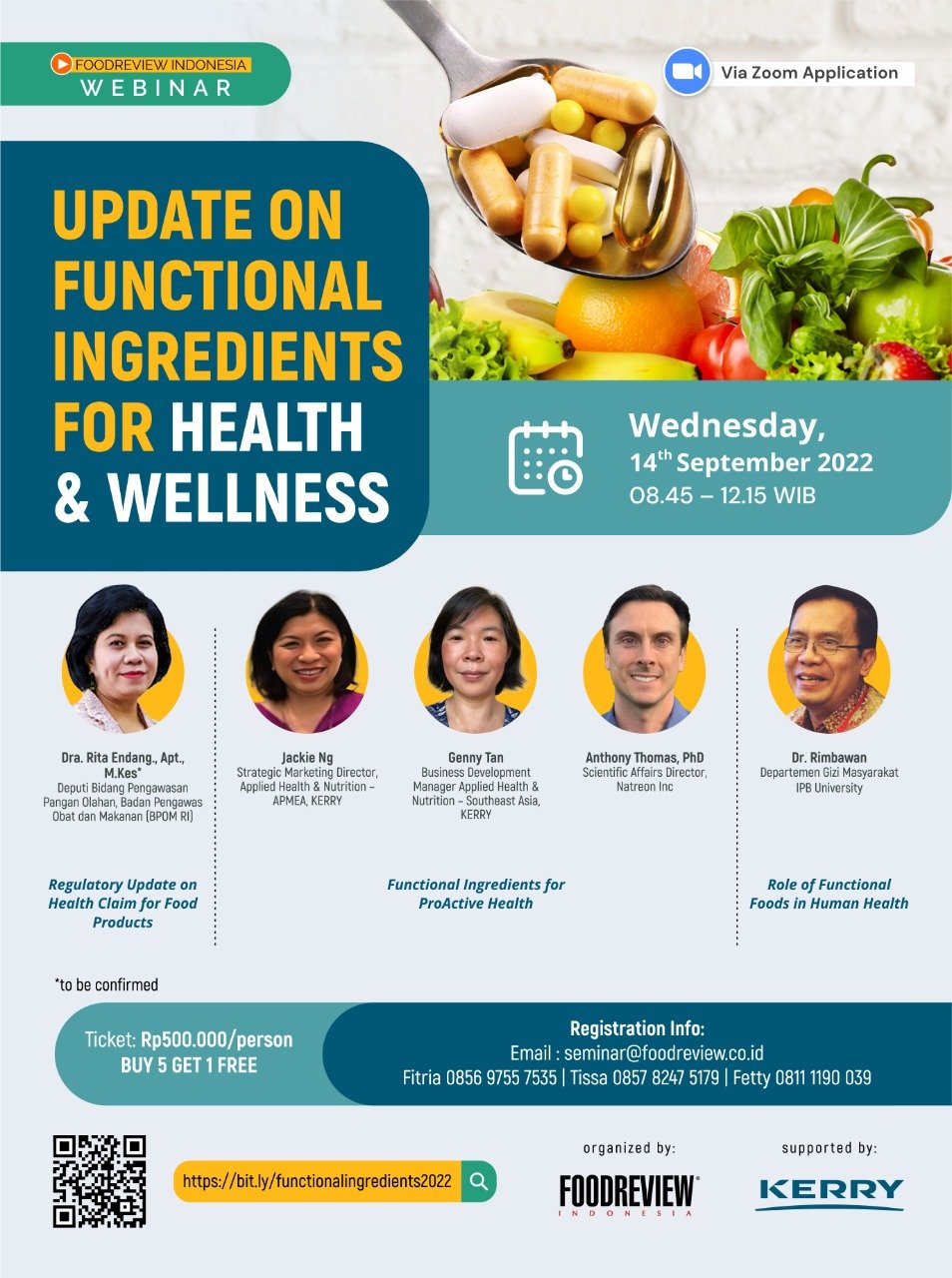Hal ini dipaparkan pada webinar Update on Functional Ingredients for Health & Wellness yang diadakan pada 14 September 2022 lalu. Webinar ini diadakan oleh Foodreview Indonesia dan didukung oleh Kerry dengan menghadirkan pembicara dari BPOM, Departemen Gizi Masyarakat, serta perwakilan dari Kerry. Pada acara ini para pembicara memberikan informasi terkini, pengetahuan terkait keamanan pangan, serta aturan atas panganan fungsional yang berlaku kepada para pelaku usaha yang bergerak di kesehatan dan kebugaran.