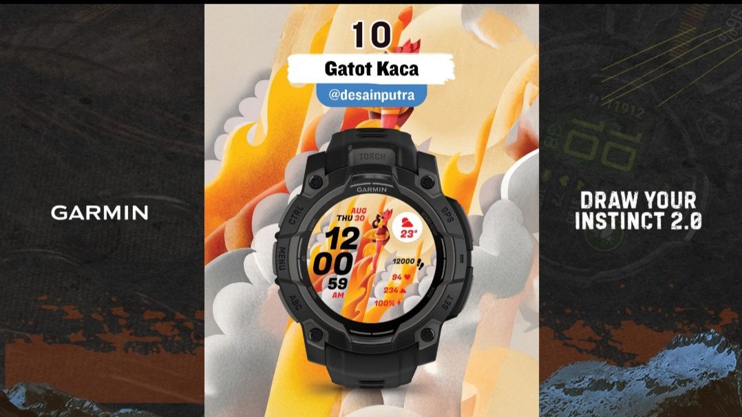 Mengusung tema Tough, Agus menghadirkan ikon pewayangan Gatotkaca sebagai metafora ketangguhan. Visual api, asap, dan batu kawah memperkuat narasi “otot kawat, tulang besi” yang lahir dari ujian ekstrem. Dengan palet merah–oranye–kuning yang intens, watch face ini menyampaikan pesan bahwa ketangguhan adalah hasil proses panjang, bukan sesuatu yang instan.