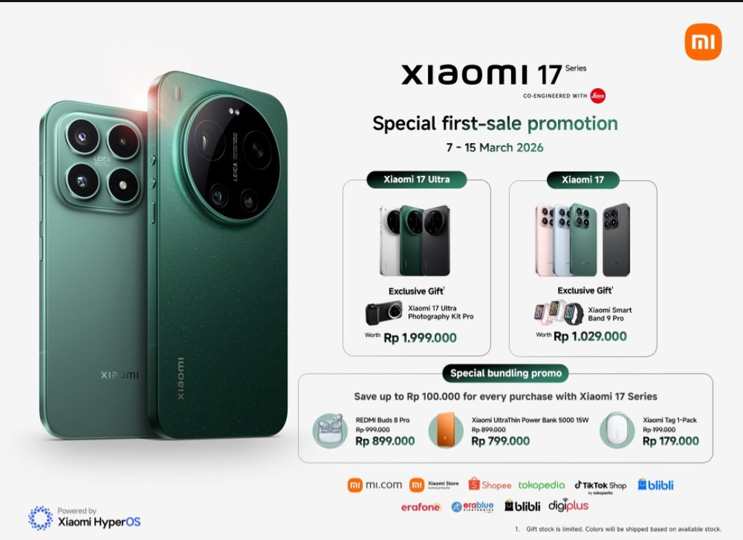 Xiaomi 17 Ultra hadir dengan value Rp19.999.000, sementara Xiaomi 17 tersedia mulai dari Rp14.999.000. Khusus selama masa penjualan perdana yang berlangsung pada 7–15 Maret 2026, setiap pembelian Xiaomi 17 Ultra akan mendapatkan exclusive gift berupa Xiaomi 17 Ultra Photography Kit untuk menunjang pengalaman fotografi profesional, sedangkan pembeli Xiaomi 17 akan mendapatkan bonus eksklusif berupa Xiaomi Smart Band 9 Pro sebagai pelengkap gaya hidup aktif pengguna.
