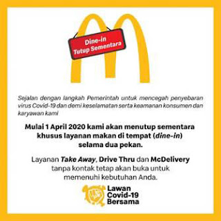 “Kami sangat mendukung pemerintah Indonesia yang berupaya mencegah penyebaran COVID-19 yang saat ini memberlakukan Pembatasan Sosial Berskala Besar (PSBB) dan kami lakukan dengan membatasi ruang berkumpul masyarakat di tengah pandemi ini. Dengan suka rela kami menutup sementara layanan dan area makan di tempat di seluruh restoran McDonald’s di Indonesia, dan mengarahkan konsumen untuk memanfaatkan layanan Drive Thru, Take Away, dan McDelivery untuk menikmati menu McD. Keselamatan dan keamanan konsumen dan karyawan adalah prioritas McDonald’s Indonesia.”