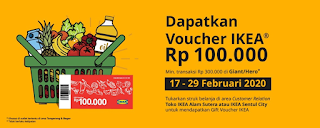 Untuk mendapatkan Gift Voucher IKEA selama periode 17 – 29 February 2020, pelanggan harus melakukan transaksi minimal Rp. 300.000 dalam satu struk pembayaran di Giant dan HERO yang berpartisipasi. Struk belanja dapat ditukar dengan Gift Voucher IKEA senilai Rp. 100.000 di IKEA Alam Sutera dan IKEA Sentul City.