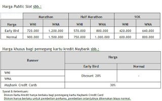 Sebagai wujud apresiasi kepada nasabah loyal yang memiliki hobi lari dan berminat mengikuti event ini, Maybank Indonesia penawaran khusus kepada nasabah melalui program bundling dan potongan harga kepada pemegang Maybank Credit Card. Pendaftaran untuk Public Slot dibuka 25 Februari 2020 dimulai dengan harga Early Bird dengan jumlah slot lari terbatas.